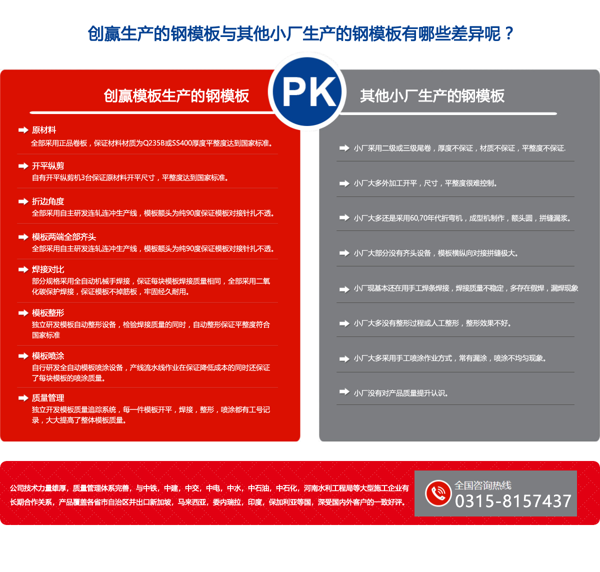 唐山創(chuàng)贏模板有限公司(原唐山豐南雙贏金屬結構廠)始建于一九九七年,是具規(guī)模實力的組合模板生產企業(yè),公司自行設計制造的十二條上卷,連軋,連沖,整形,機械人焊接,調直,噴漆,打包鋼模板生產,實現了自動化一條龍生產,品質優(yōu),效率高,規(guī)格型號為:寬度100-1200mm, 長度300-3000mm, 板厚1.8-4.0mm。